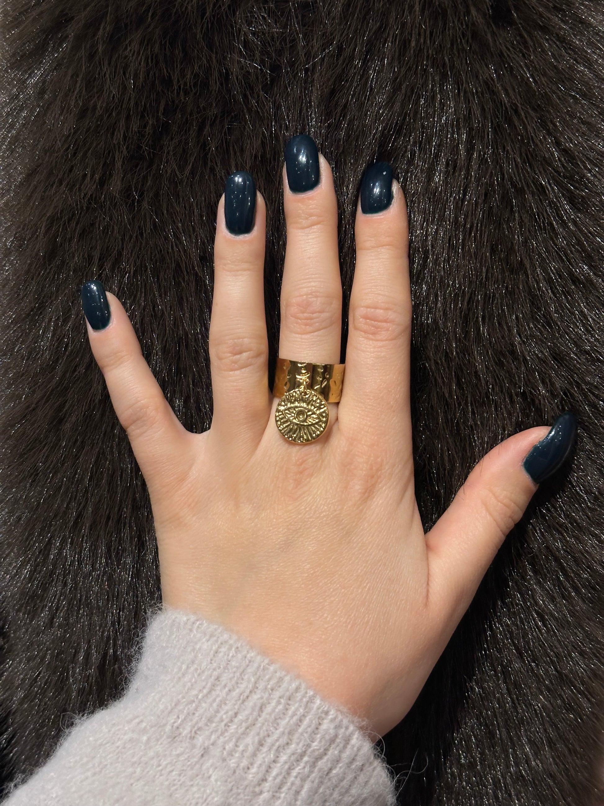 Jolie bague dorée avec gri-gri en forme d’œil doré !