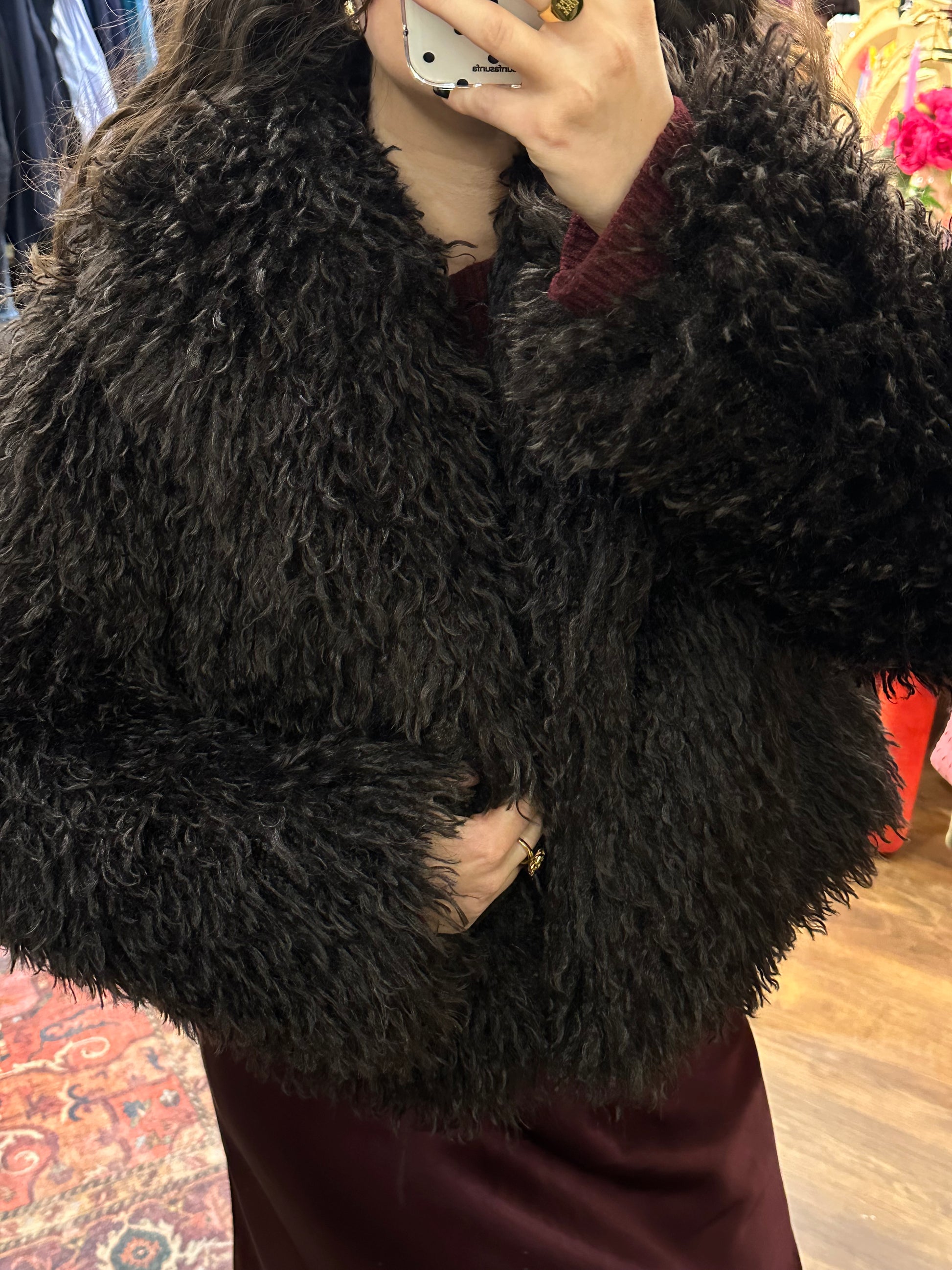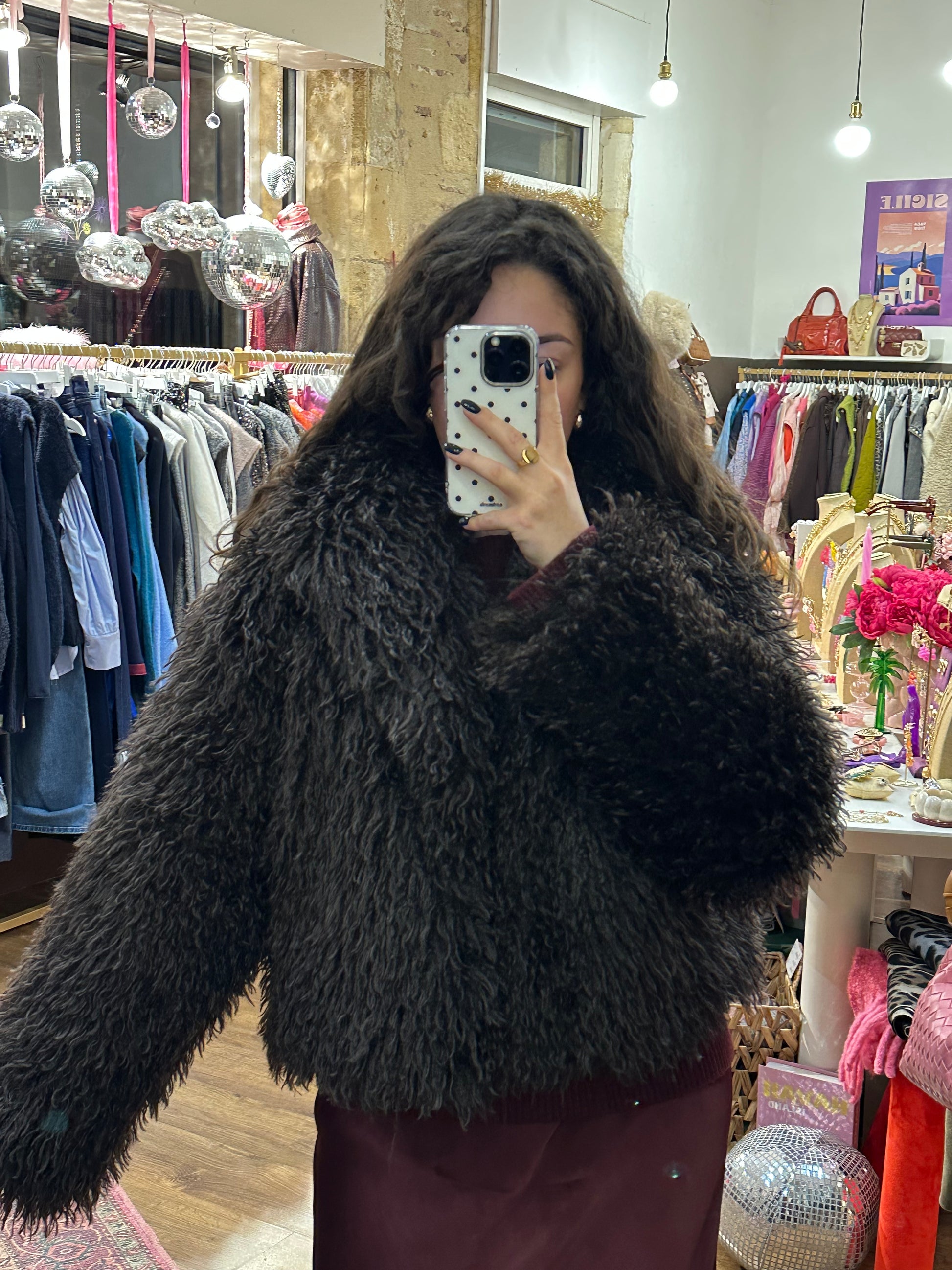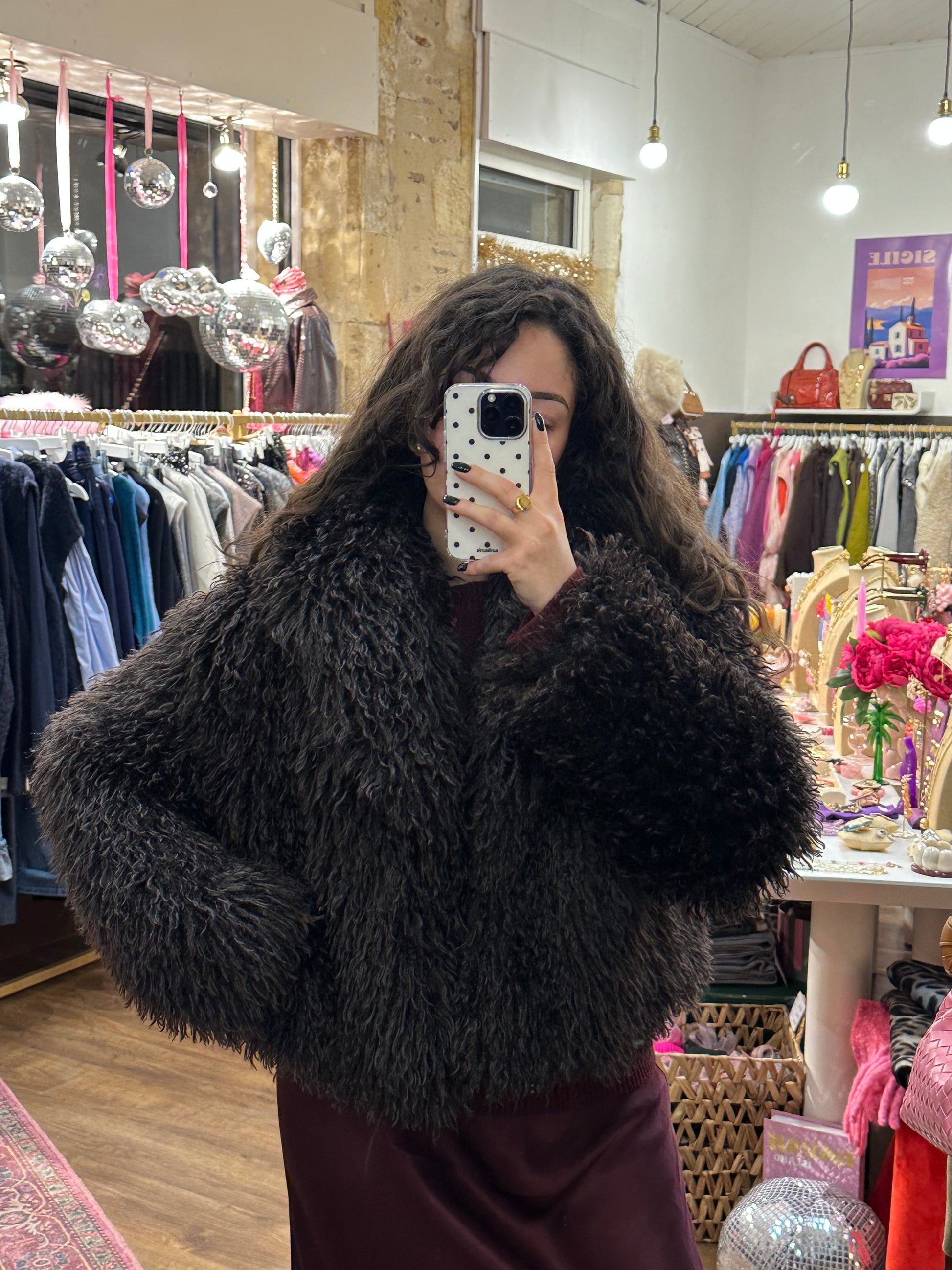 Une magnifique fausse fourrure marron chocolat avec sa coupe courte et oversize et son effet poil frisé !