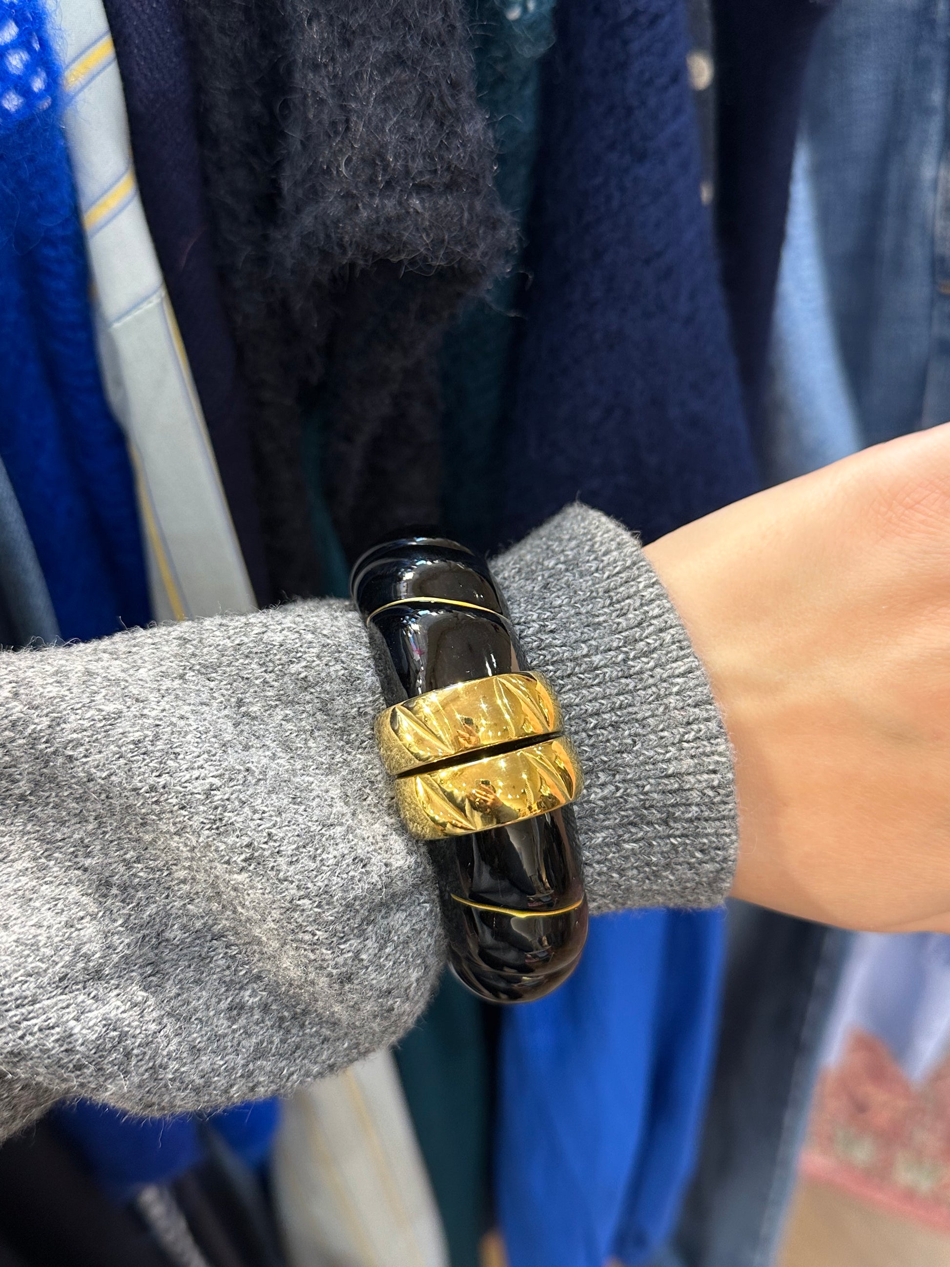 Cette magnifique manchette torsadée noire avec son joli fermoir doré est une belle idée cadeau ou peut sublimer un simple look !