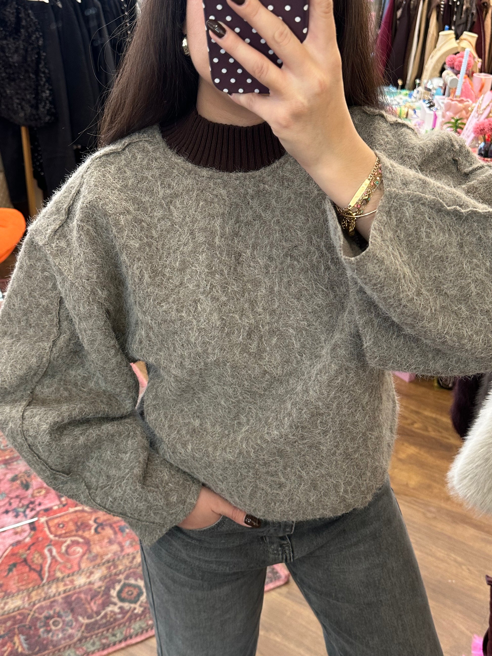 Gisèle est un magnifique pull en feutrine gris taupe avec son col marron chocolat et ses jolies manches ballons qui font tout son charme et son originalité !