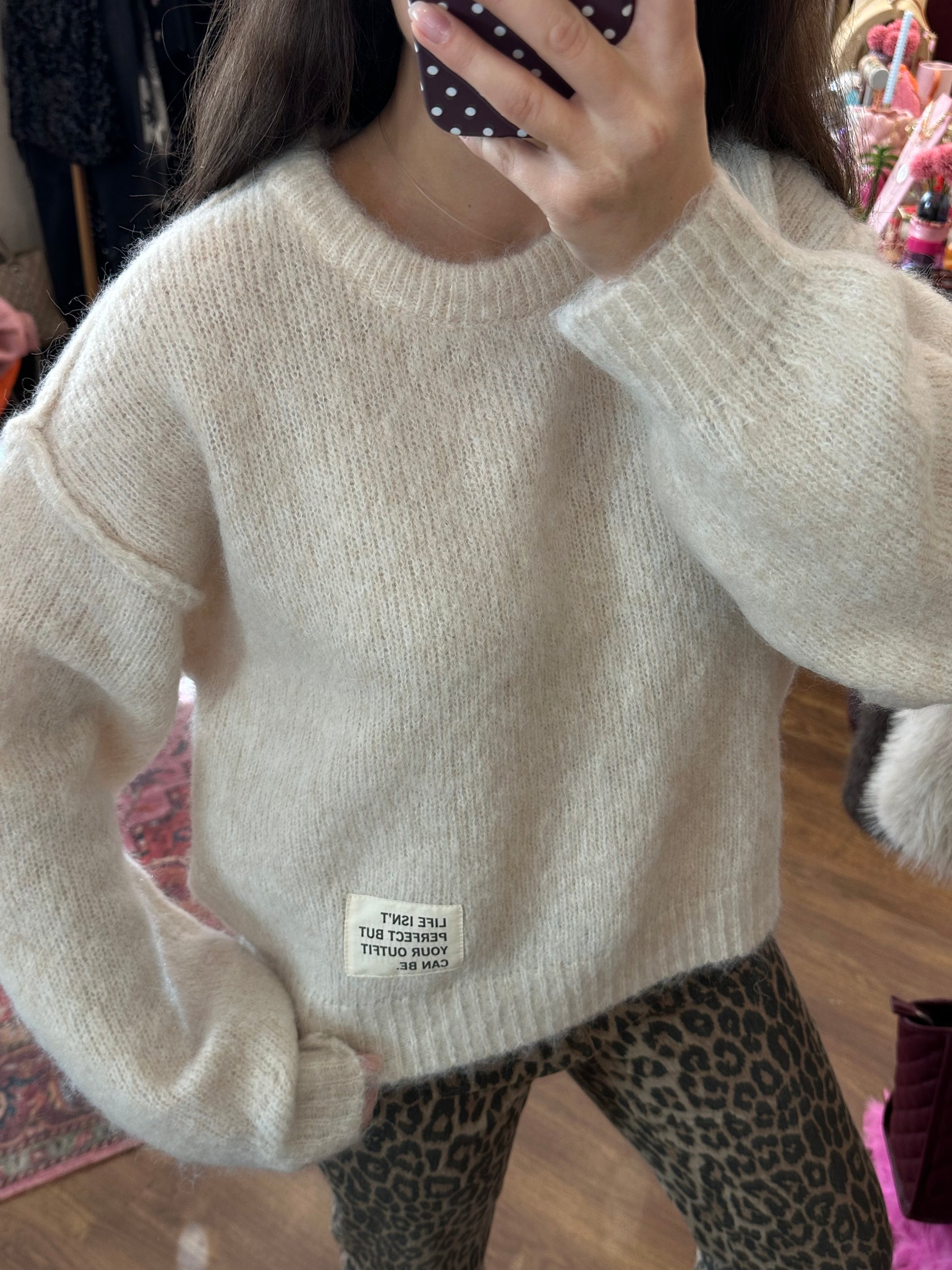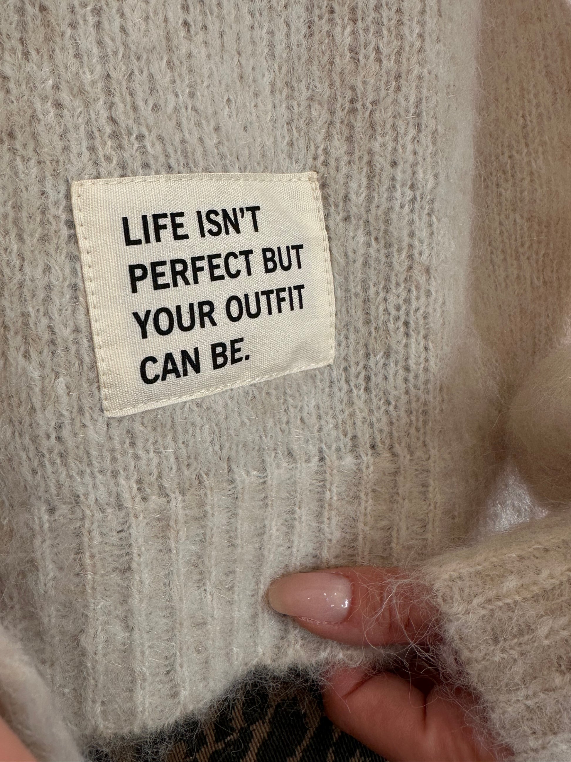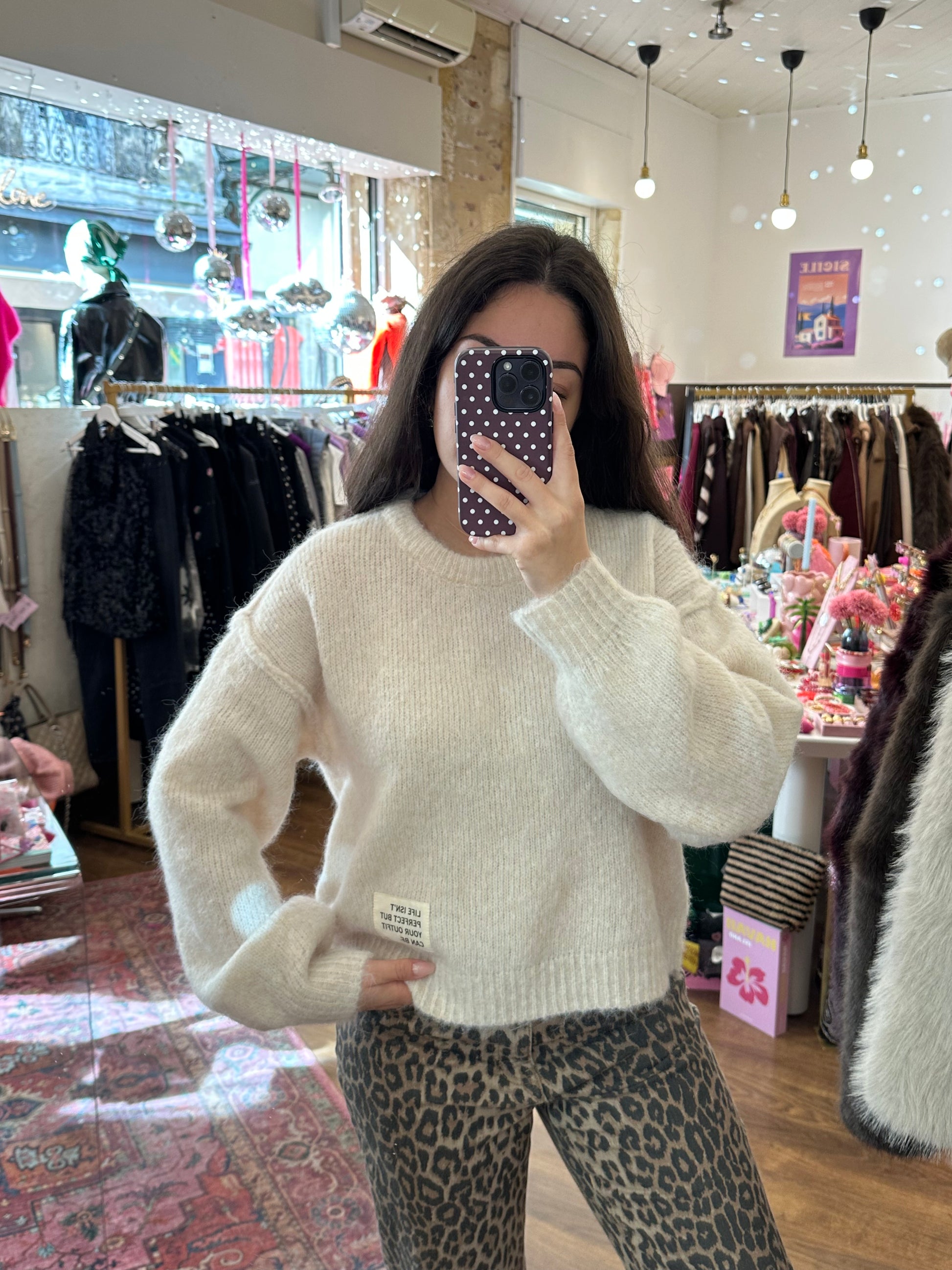 Paolo c’est notre joli pull écru indispensable dans sa garde-robe avec une jolie inscription encadrée « Life isn’t perfect but your outfit can be »