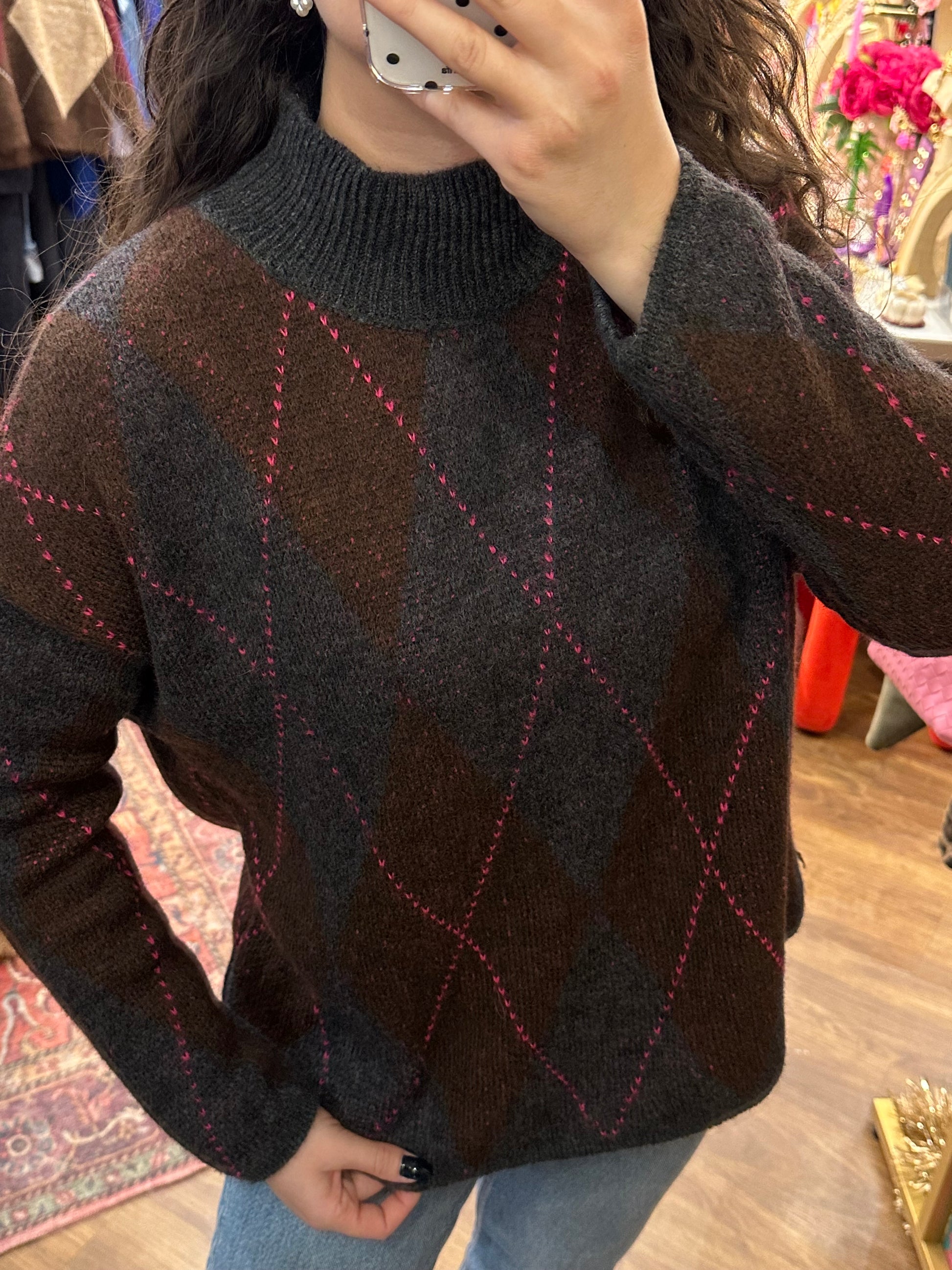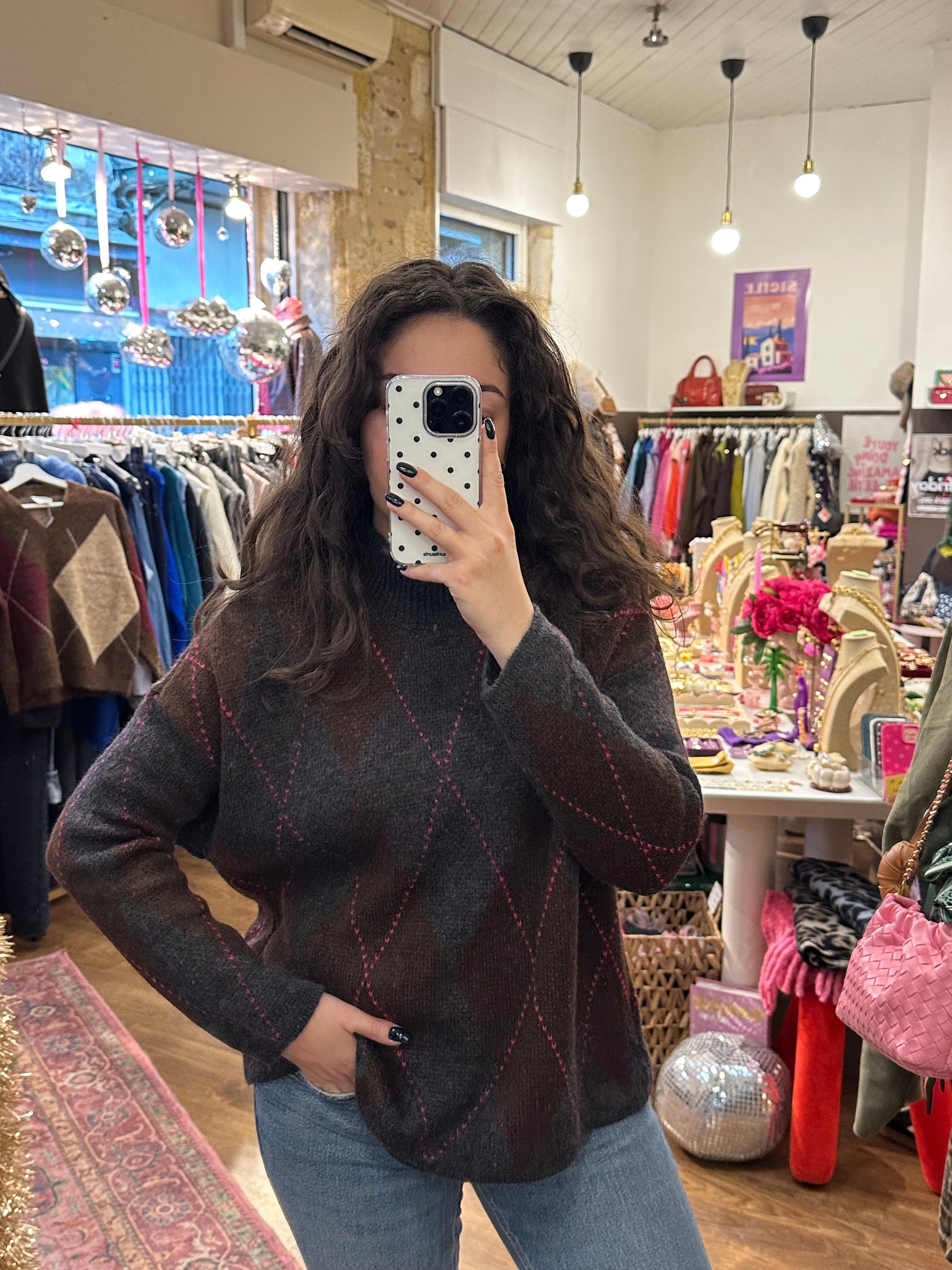 Notre pull Timour et son magnifique motif argyle avec ses petites touches de rose fuschia et sa coupe oversize !