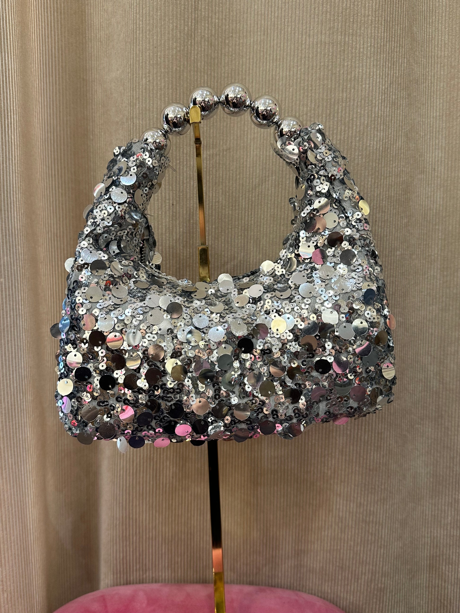 Faites briller vos looks de fêtes de fin d’année avec notre éclatant sac disco argenté et sa anse rigide composée de 6 boules argentées effet miroir !