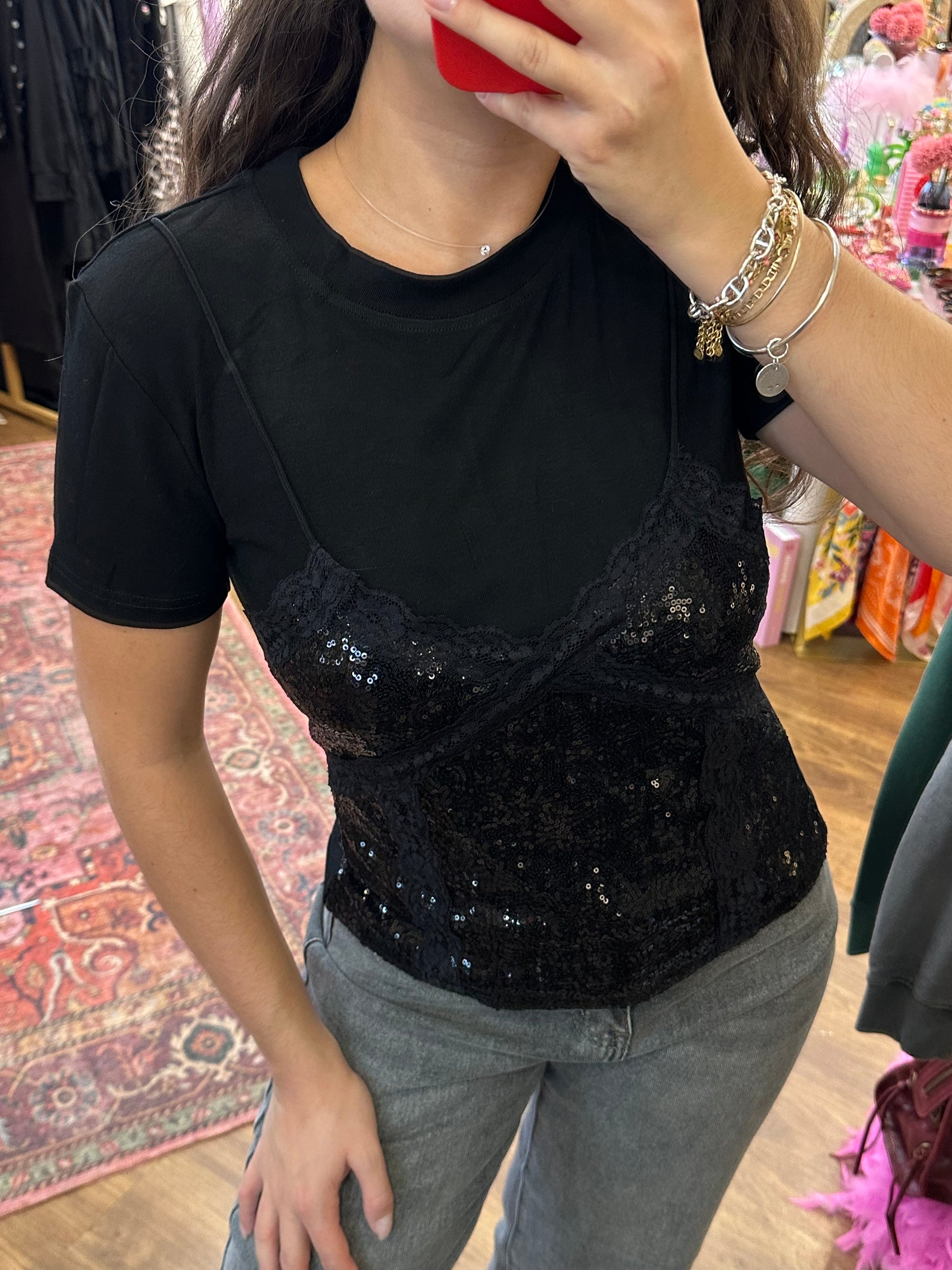 Ce petit tee-shirt noir est à la fois confortable, élégant et original de part son caraco à paillettes noires ! Il pimpera discretement un look noir et se marie à la perfection avec un blazer oversize !