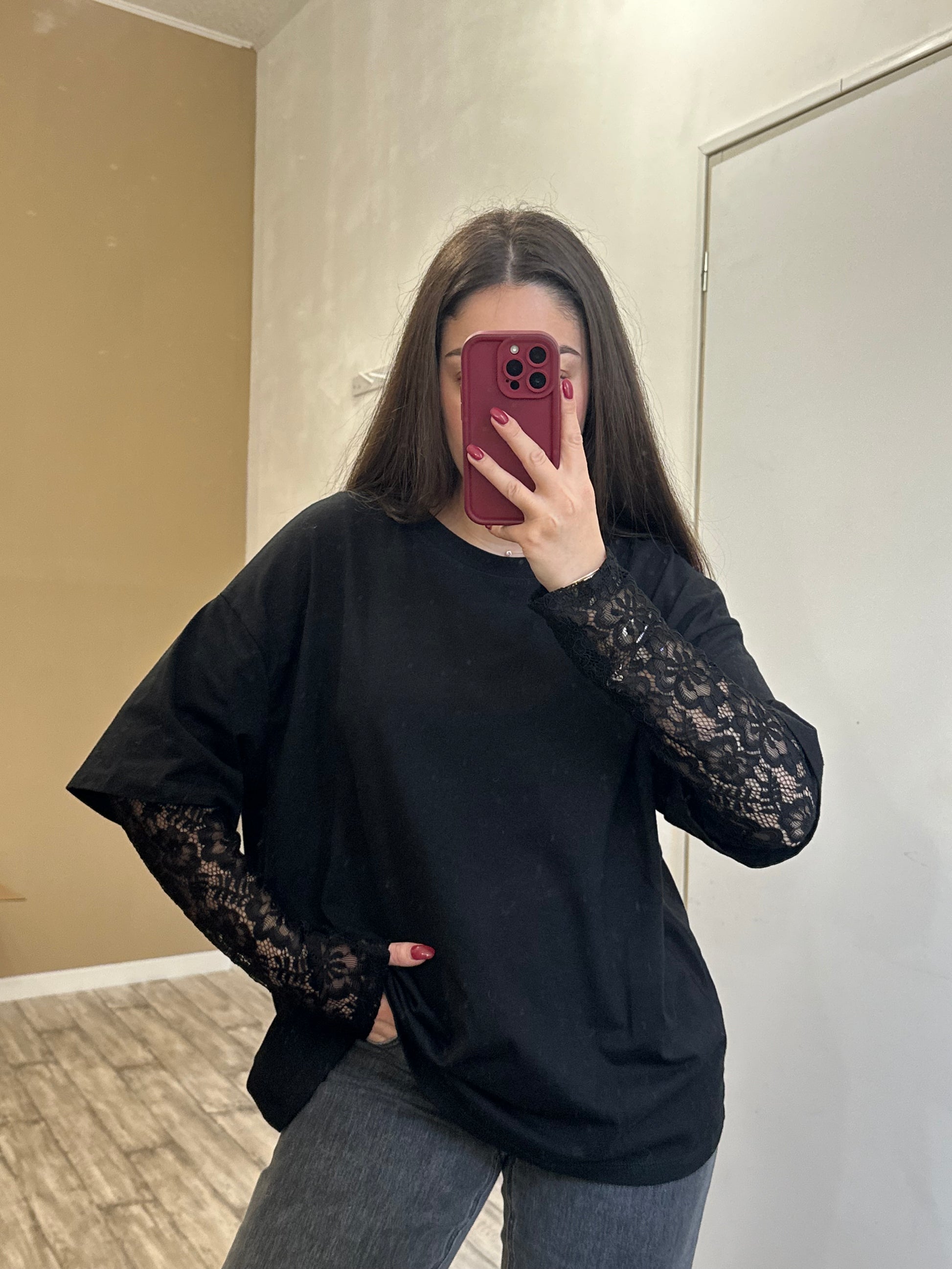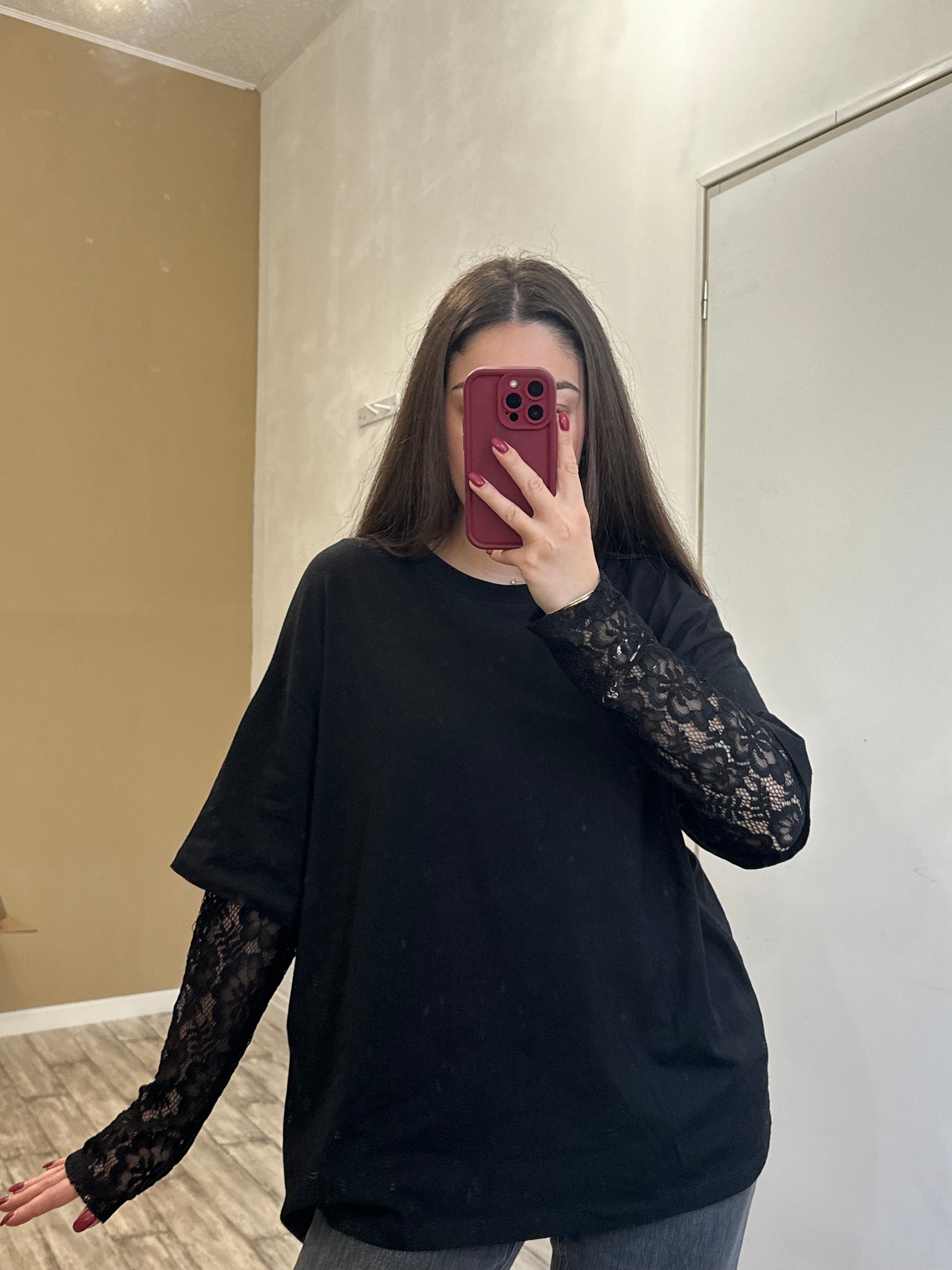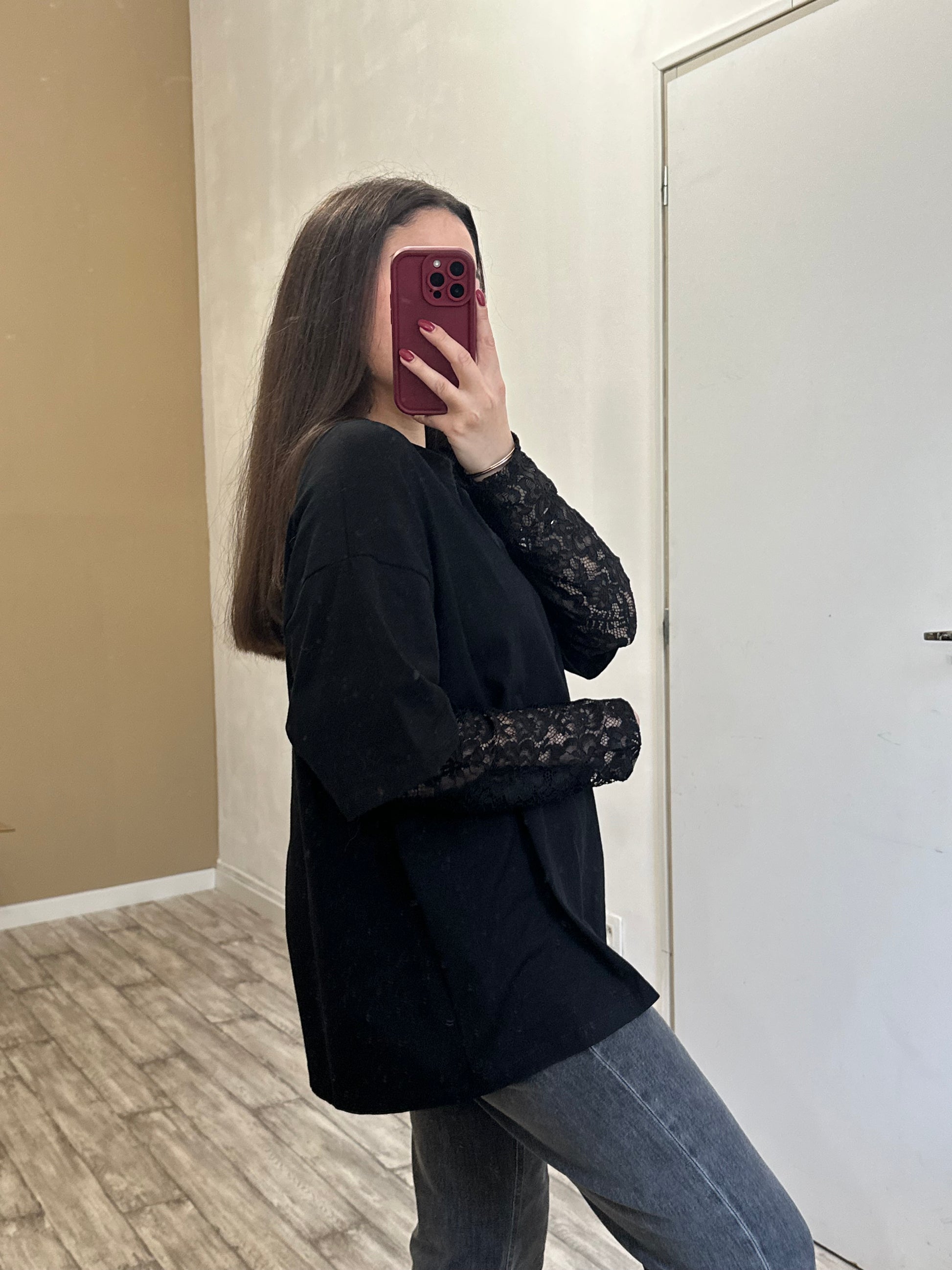 Le tee-shirt star du moment, c’est lui ! Avec sa coupe oversize et ses manches en dentelle noire, il convient à tous les styles ! (disponible également en blanc)