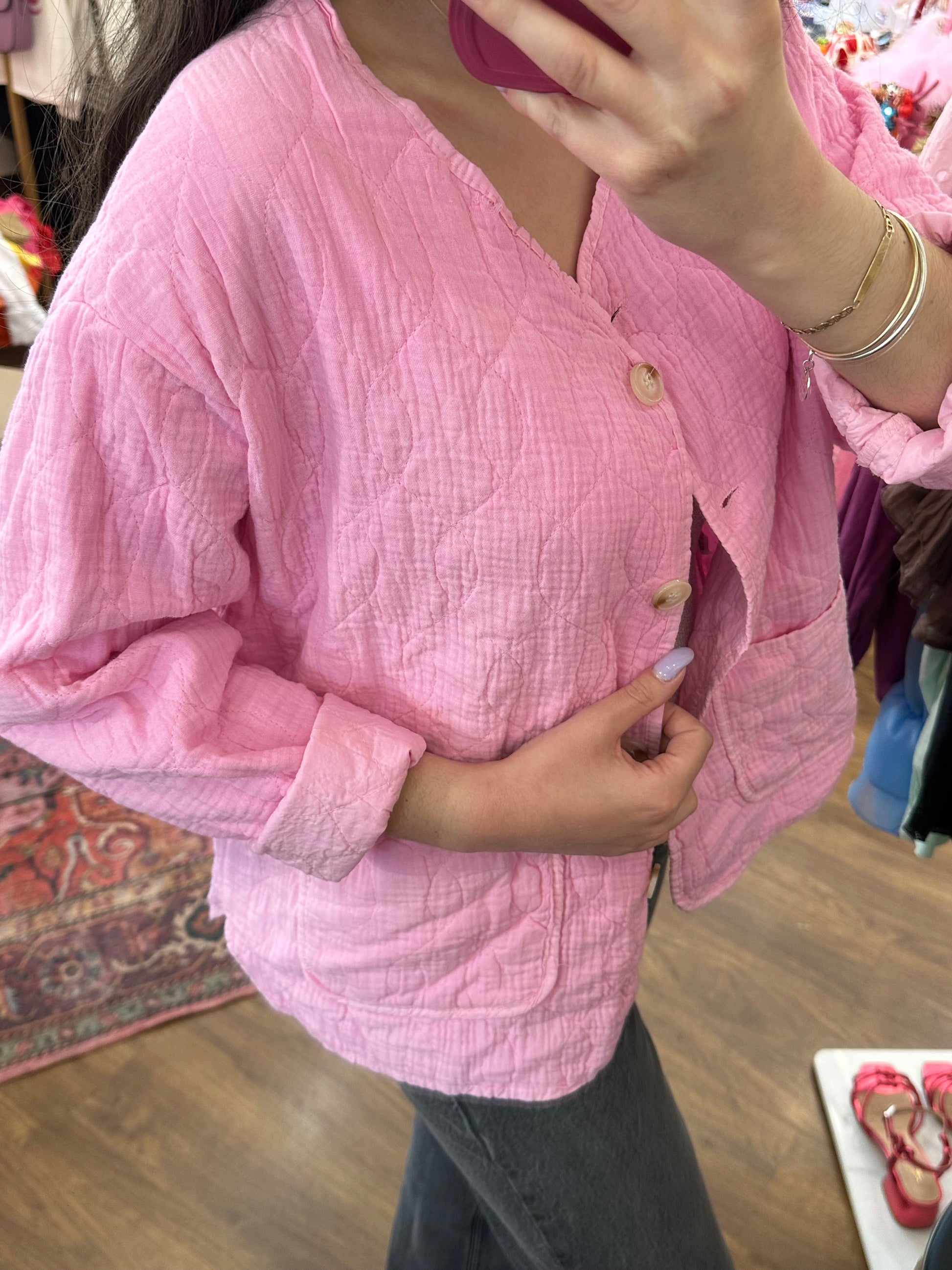 Une veste en gaze de coton c’est l’idéal pour les soirs d’été ou les fraîches matinées. Disponible en rose bonbon, pistache, jaune, kaki.